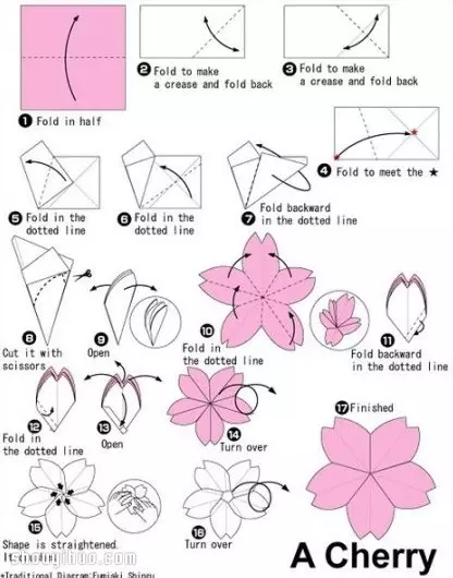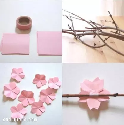 樱花制作方法:准备粉色纸张、枯枝、透明胶布、剪刀。首先将纸张按照图解折叠并剪一刀,摊开来就得到了可爱小樱花,不过这个时候樱花还是平面的;接着按照图11-16处理,让樱花变得立体;最后用透明胶带将樱花粘贴到树枝上,一束美丽的樱花花束就DIY制作完成了。