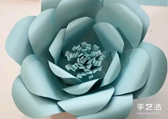 将花蕊粘贴到纸花的中心,美丽手工纸花就完成了。