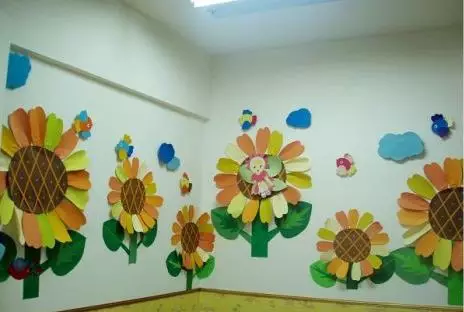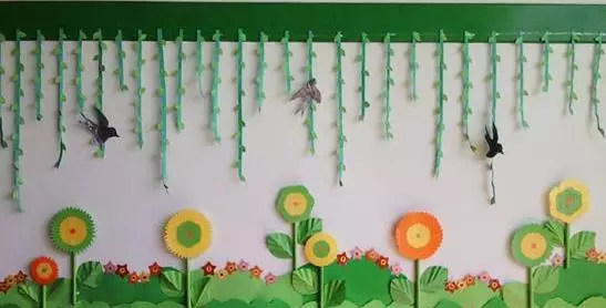 春天的环境布置主要可以使用的元素有:花朵、昆虫、燕子、风筝、柳条等,用生机勃勃的环境给幼儿传递春天的活力。