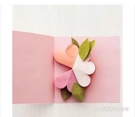 首先在绿色纸张上画出心形并剪出;然后在心形凹陷处浅浅的剪一刀,用胶水将两边粘合起来,就得到了一片立体的三叶草叶片;最后在绿纸上剪出叶柄,并将三片叶片按照图示粘贴到叶柄上,带有浓浓绿意的三叶草就制作完成了。