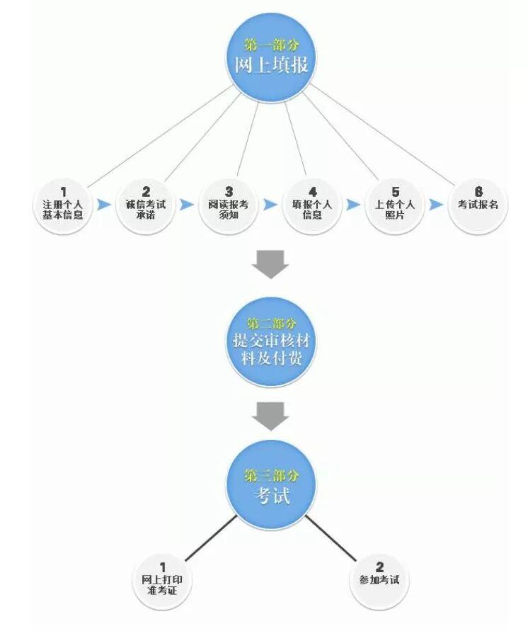 (一)报名流程:考生网上报名→现场信息确认→考生网上缴费,报名成功。